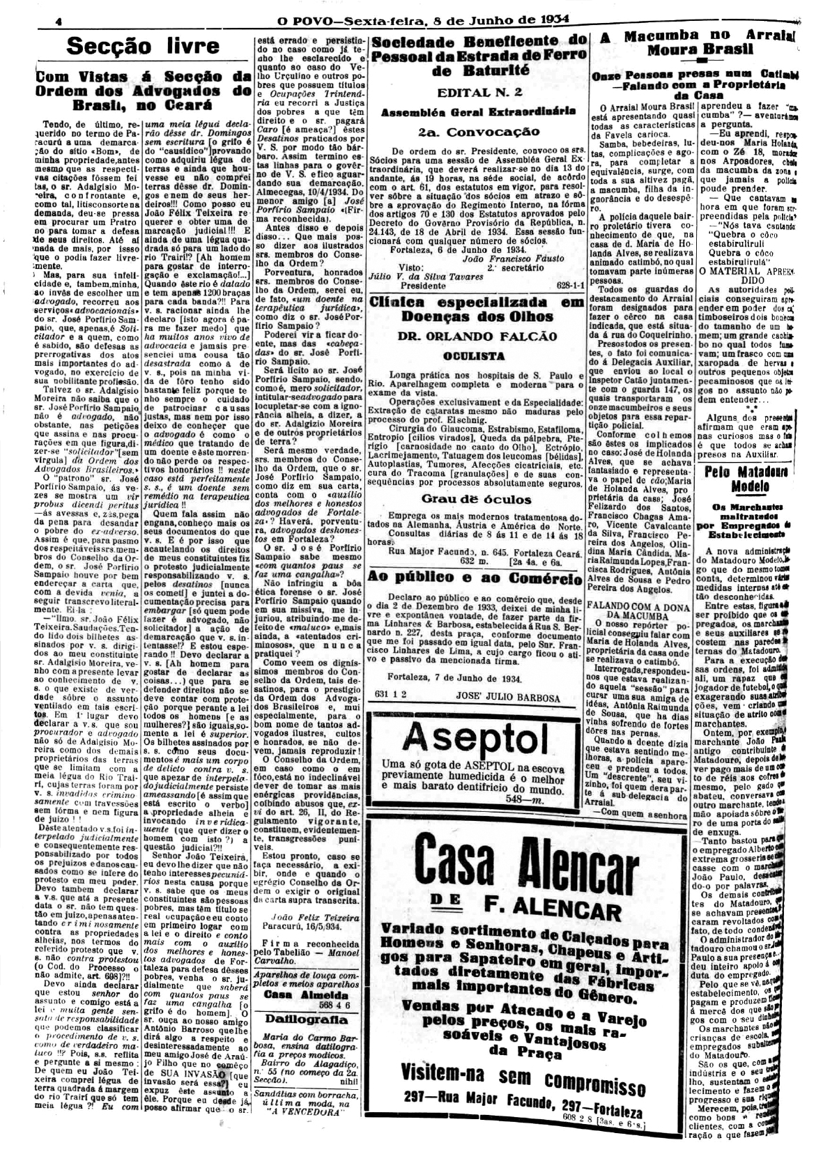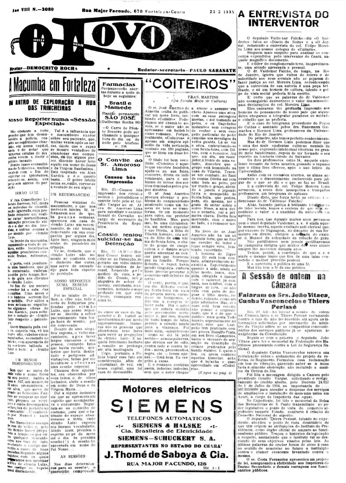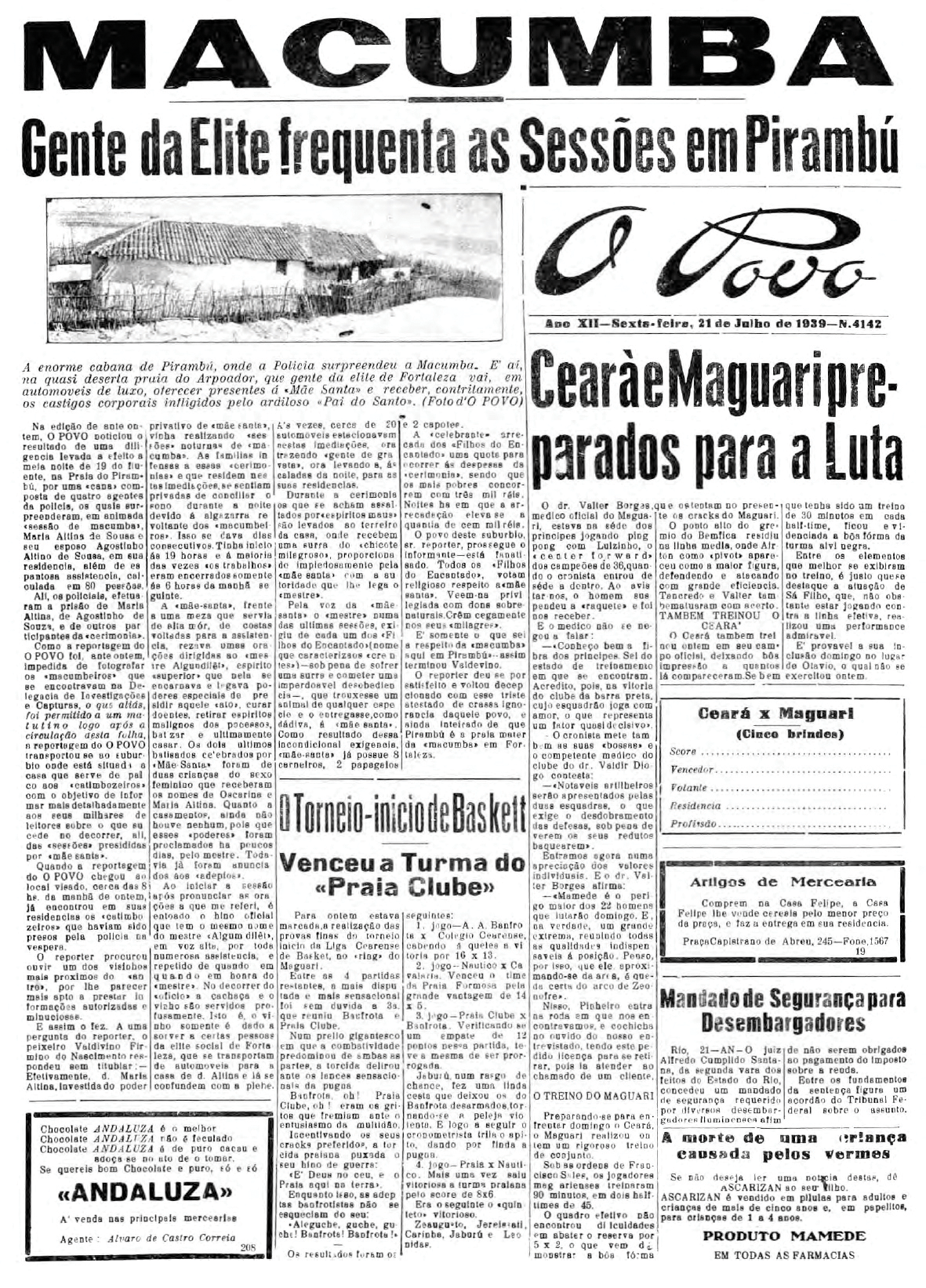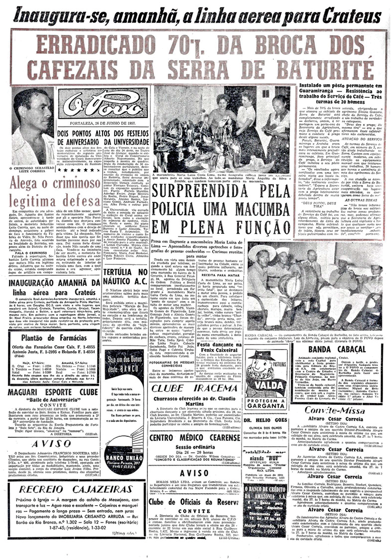 Onze pessoas foram presas na casa de dona Maria de Holanda Alvez quando estava sendo realizada uma cerimônia de cura de uma amiga. A polícia recebeu a denúncia de um vizinho e foi ao local. Todos foram presos e conduzidos à delegacia junto com os pertences e material associados ao ritual. No texto, o repórter associa a religião a uma "altivez pagã, filha da ignorância e do desespero".